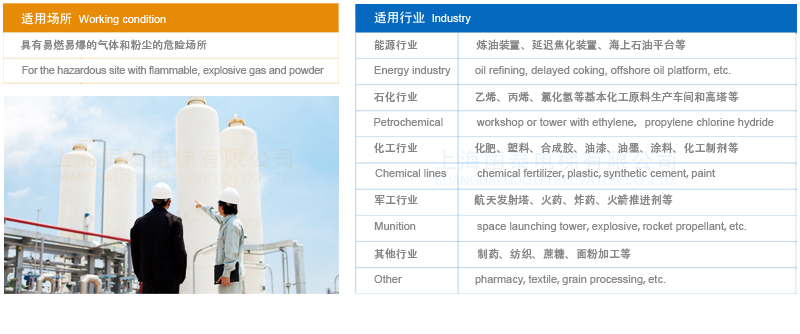 In dangerous places where there are explosive gas mixtures or dust, electrical sparks or static electricity on the surface of electrical appliances, as well as heat and sparks generated by mechanical friction and impact, may cause explosions and cause major accidents. Cathay Pacific Explosion-proof Elevator is an elevator product that can be used in this type of environment. It is widely used in special places and environments such as petroleum, metallurgy, chemical industry, medicine, gas, energy, military industry and so on.